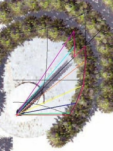 Once the sun reaches due west (where it is at June asr prayer times) the gnomon point will have climbed by about .4 of the radius of the tower. (If the Tower top were sliced at a 45 degree angle and it was pointed north, then the western side of the tower would be the taller than the slot side by the radius of the Tower. As it is, the tower top is sliced at a 30 degree angle, according to the Tower Section view, yielding 2/3s of the height gain of a 45 degree slice. Also, the tower-crescent points 35 degrees clockwise from north. That cuts the rise down by roughly 35/90 = 39 percent, and 61 percent of 2/3s = .41.) At 35 degrees from north, the slot-gnomon is positioned .57r west of the center of the Tower circle (sine or cosine of 35, depending on where you are measuring your degrees from). The due-west gnomon (the June gnomon), is r west of center, so it moves west (away from the ellipse of trees) by about the same amount that it rises: about .4r. Lastly, June asr prayer shadows descend at an angle substantially flatter than 45 degrees (their length of 37.39 meters, compared to the Tower height of 28.35 meters, implies an angle of descent of 36.22 degrees). With the June gnomon rising about the same amount as it moves away from the tree line, this flatter than 45 degree shadow path to earth will push the Tower’s asr-prayer time out by a modest fraction of the radius of the tower. Since the prayer-line at that point is a bit towards the inside of the tree line, this moves it a little closer to the base of the trees.