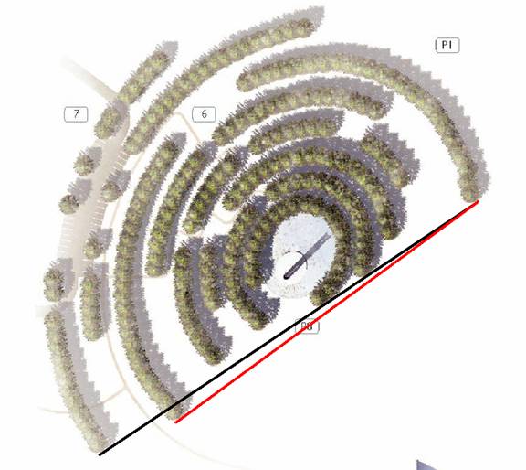 The first assumption is that the bottom of the Tower is at the same level as the inner ellipse of trees (i.e. that the ground is flat). Is this assumption correct? The site-plans include a Tower Section detail that shows the Tower sitting on a raised base, about ten feet above grade. It also depicts the trees in the background as planted at grade-level, below the raised base. If this section view is correct then my assumptions about the topography are incorrect. Instead of sitting at the same level as the trees, the Tower sits ten feet above, and its shadows fall correspondingly further out.