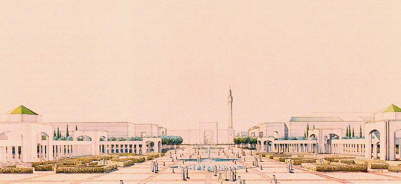 Comparing the surrounding streets in the plan view with Google Earth's satellite view of the campus verifies that a person facing into this arched facade will be facing pretty much exactly at Mecca. The other mosque features are also present: the colonnade, the minaret, ablution waters, but unlike the terrorist memorial mosque at the Flight 93 crash site, this masterpiece of mosque design was never built.