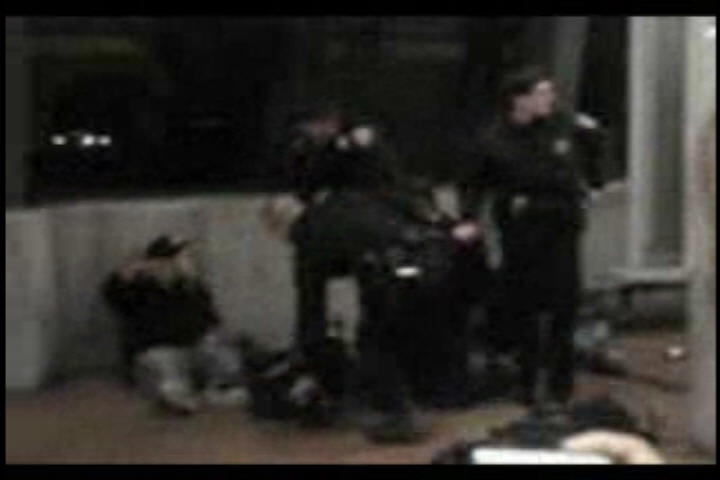 1. The other cell phone video, from a bit further right, corroborates the movement of Grant’s left arm. It isn’t as clear, because officer Pirone is more in the way, but a couple of the frames do show the movement of Grant’s arm. Here is the frame just before officer Mehserle’s gun goes off: