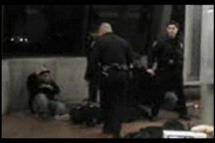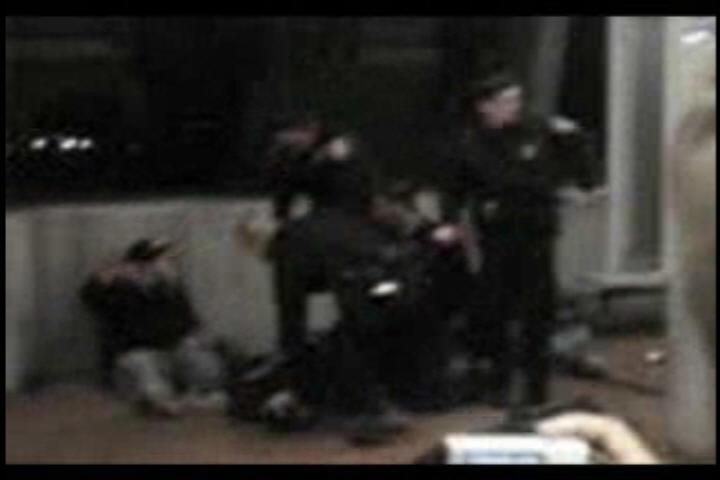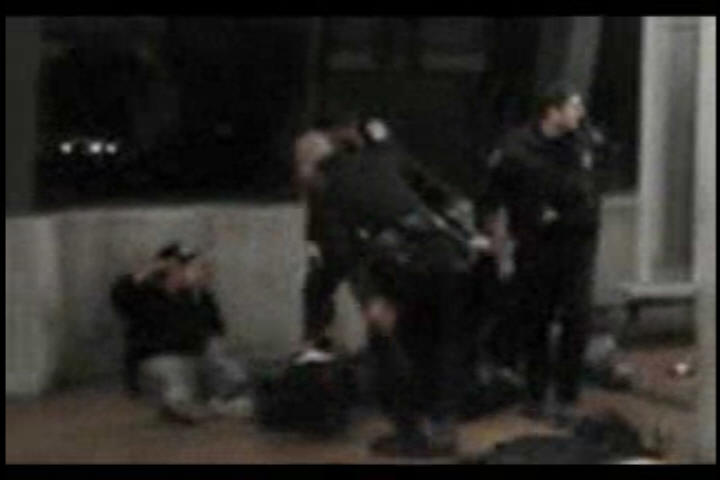 1. The other cell phone video, from a bit further right, corroborates the movement of Grant’s left arm. It isn’t as clear, because officer Pirone is more in the way, but a couple of the frames do show the movement of Grant’s arm. Here is the frame just before officer Mehserle’s gun goes off: