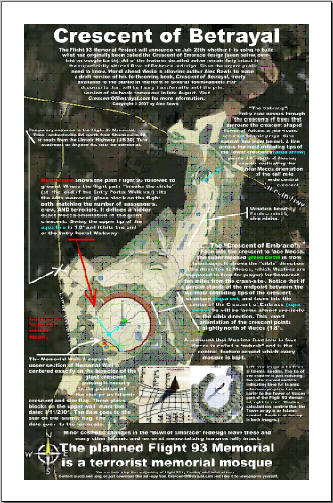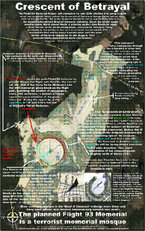 Has the size and the resolution to provide clear graphical proof of a couple of the main terrorist memorializing features of the crescent design. Comes out great on Kinko's glossy cardstock ($3 a pop). You might have to explain that they have to choose "no scaling" in the "page handling" section of Adobe's print dialog box, otherwise the print software will automatically increase the margins. (Content is same as for the large ad copy posted below, but the ad copy is borderless. Kinko's can print that version too. Just tell them it is designed to print at 300dpi on 11 x 17 paper with 3/4 in borders.)