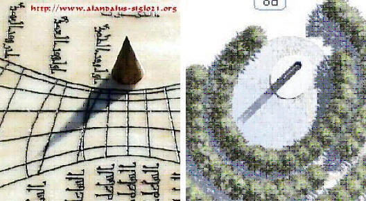 Left image: a traditional Islamic sundial (photo © Germán Moreno, 2006). The shadow has just reached the outer curved vertical, indicating time for Islamic afternoon prayers. The image on the right is the Tower of Voices portion of the planned Flight 93 Memorial. It is also an Islamic sundial. Shadow calculations confirm that, on any day of the year, when the Tower shadow reaches the inner arc of trees, it will be time for Islamic afternoon prayers.